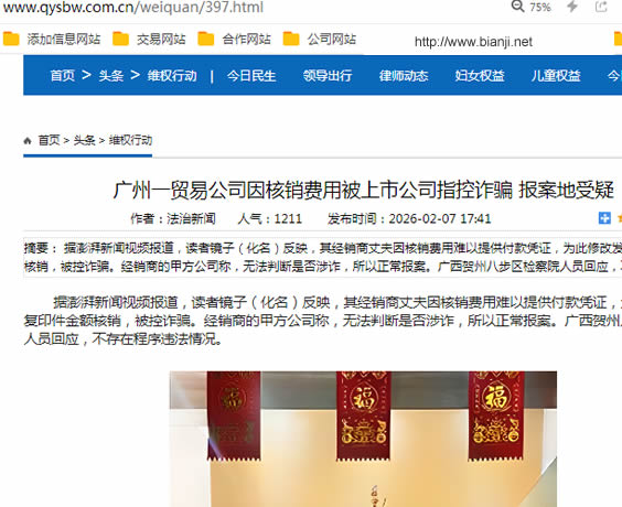 據(jù)媒體報道,澎湃新聞讀者鏡子(化名)反映,其經(jīng)銷商丈夫因核銷費用難以提供付款憑證,為此修改發(fā)票復(fù)印件金額核銷,被控詐騙。經(jīng)銷商的甲方公司稱,無法判斷是否涉詐,所以正常報案。廣西賀州八步區(qū)檢察院人員回應(yīng),不存在程序違法情況。